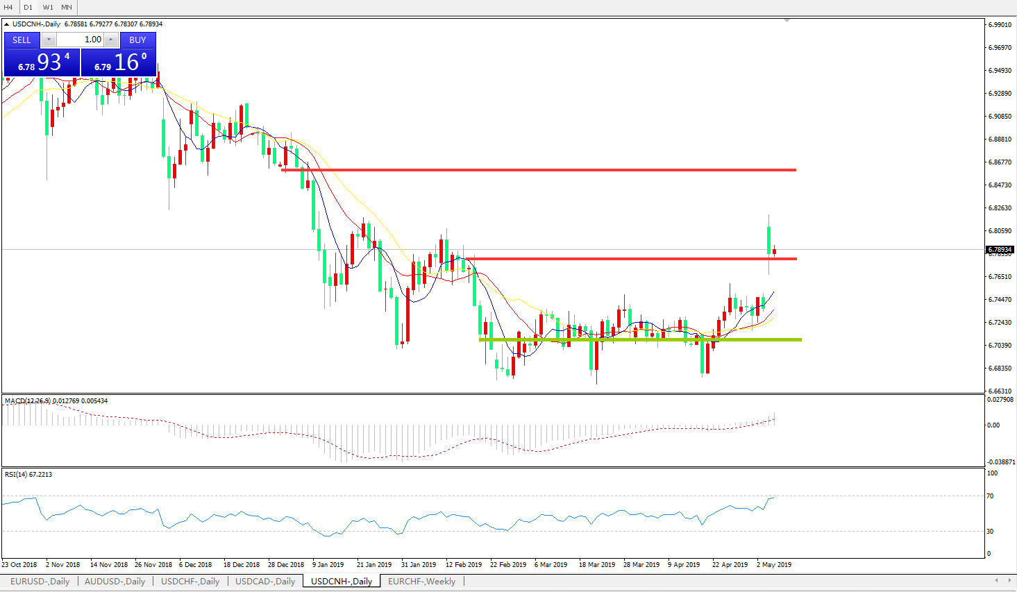 交易策略6.6990之上,看涨,目标价位为6.7845,然后为6.8200