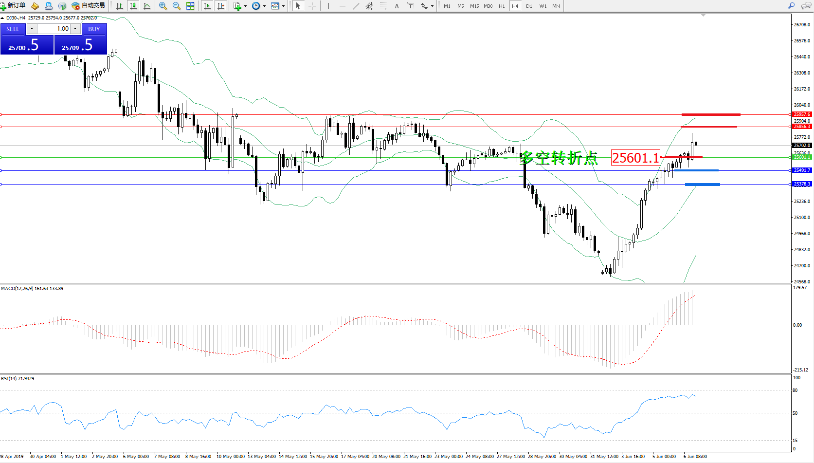 道琼斯指数DJ30—— 4小时K线图显示: