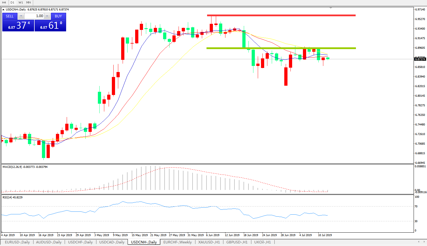 技术面简析:日线图多均线粘合无方向,MACD徘徊在0轴附近且动能柱若隐若现,RSI逐步走平,预计短期汇价将继续整理,中期关注7.0整数关口压制是否有效及中美贸易谈判最新进展。
