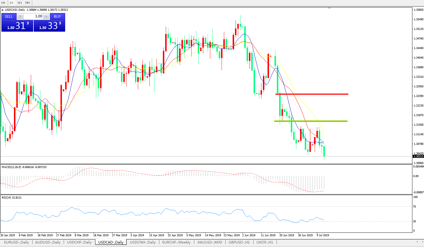 技术面简析:日线图均线仍呈有序空头排列,价格昨日再破前低逼近1.30关口MACD在0轴下方运行动能柱有再度放量迹象RSI反弹乏力再度下行预计短线汇价或将继续疲弱,重点关注1.30关口支撑是否有效