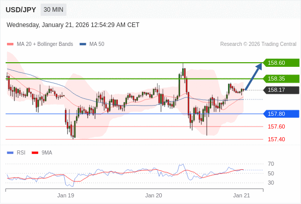 在 157.80 之上,看涨,目标价位为 158.35 ,然后为 158.60 。