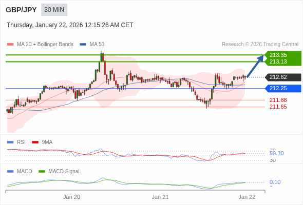 英镑/日元 当日内 : 看涨,当 212.25 为支撑位。