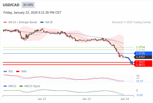 技术点评: RSI技术指标小于30。在这种情况下,说明有很强的下跌趋势,或者意味着处在超卖的状态下,可能会有向上的反弹。我们将观察RSI技术指标是否出现背离现象。 MACD技术指标处在其信号线之下看空。 配置为负。 此外,价位低于其20天及50天移动平均线 ( 分别位于1.3747 和1.3773 )。