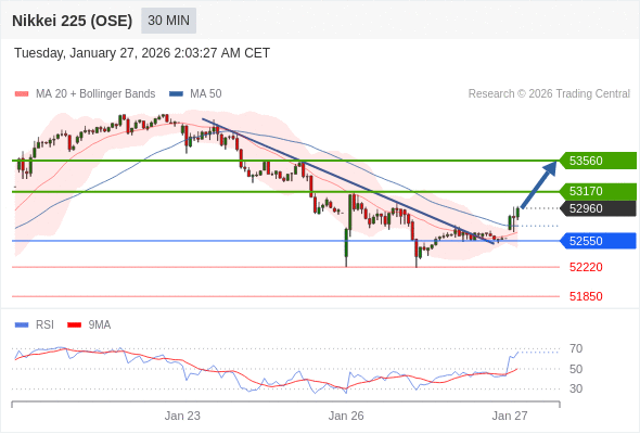在 52550 之上,看涨,目标价位为 53170 ,然后为 53560 。