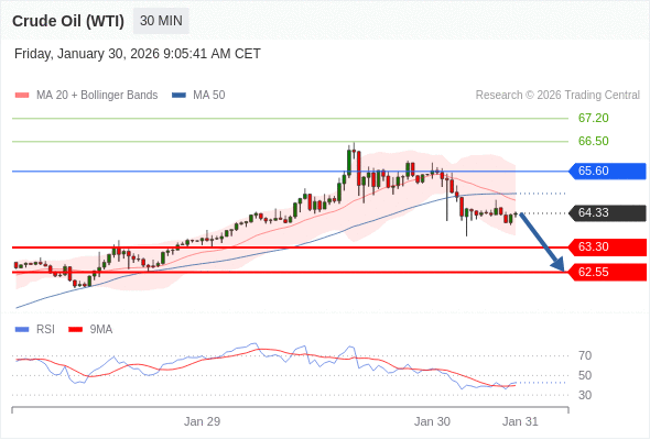 在 65.60 之下,看跌,目标价位为 63.30 ,然后为 62.55 。