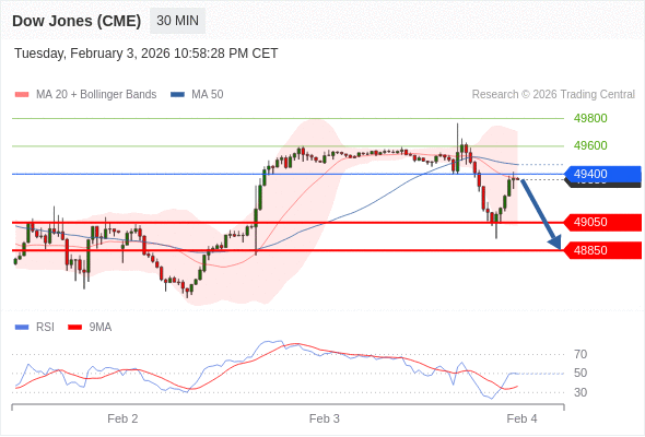 在 49400 之下,看跌,目标价位为 49050 ,然后为 48850 。