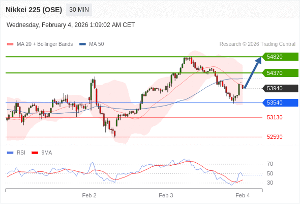在 53540 之上,看涨,目标价位为 54370 ,然后为 54820 。