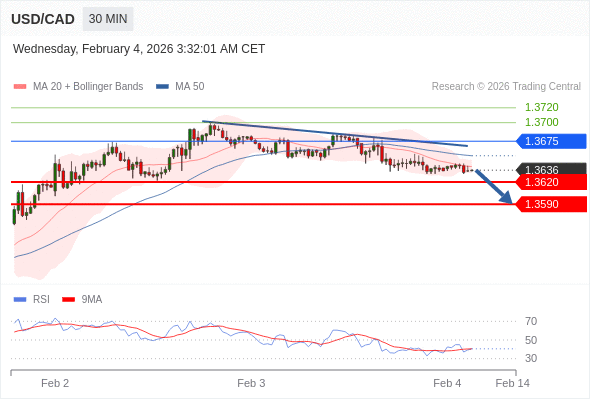 在 1.3675 之下,看跌,目标价位为 1.3620 ,然后为 1.3590 。