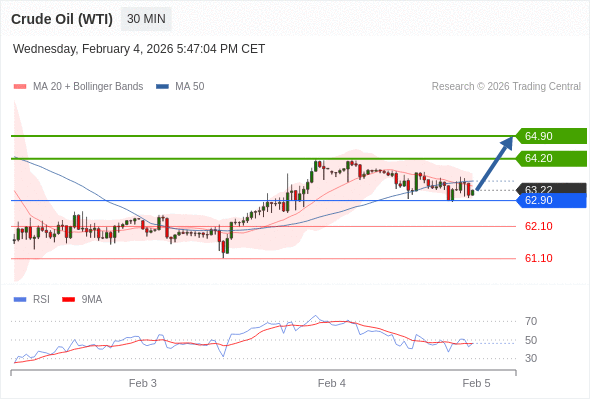 在 62.90 之上,看涨,目标价位为 64.20 ,然后为 64.90 。