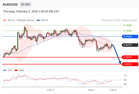 交易策略: 在 0.7010 之下,看跌,目标价位为 0.6935 ,然后为 0.6910 。