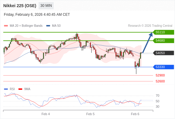 交易策略: 在 53330 之上,看涨,目标价位为 54680 ,然后为 55110 。