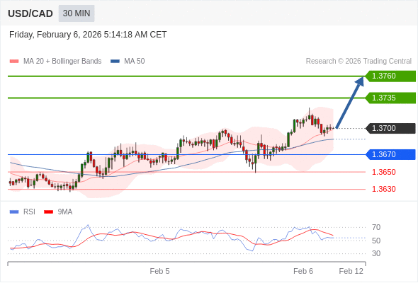 在 1.3670 之上,看涨,目标价位为 1.3735 ,然后为 1.3760 。