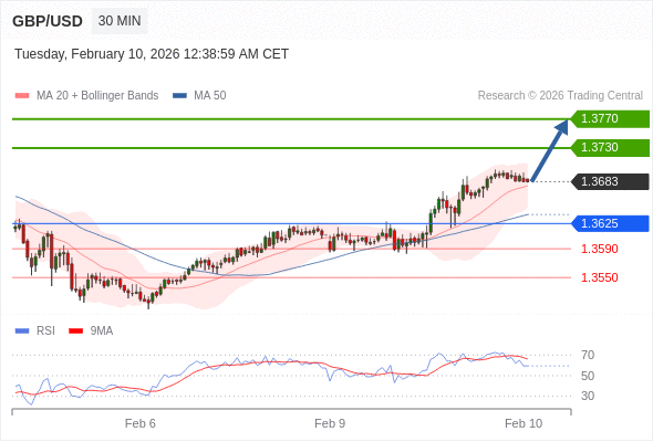 在 1.3625 之上,看涨,目标价位为 1.3730 ,然后为 1.3770 。