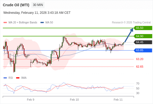 在 63.85 之上,看涨,目标价位为 64.90 ,然后为 65.50 。