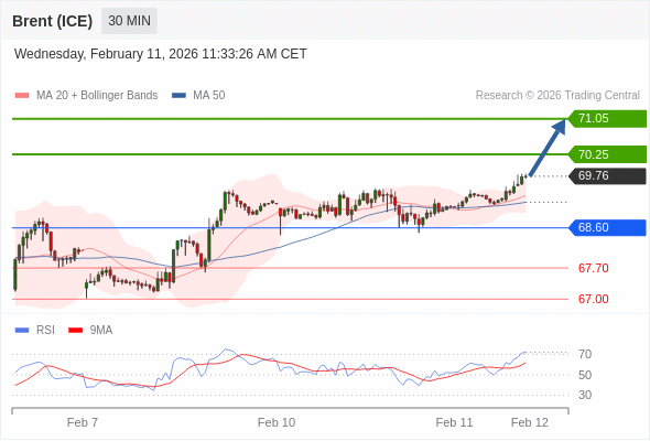 在 68.60 之上,看涨,目标价位为 70.20 ,然后为 71.05 。