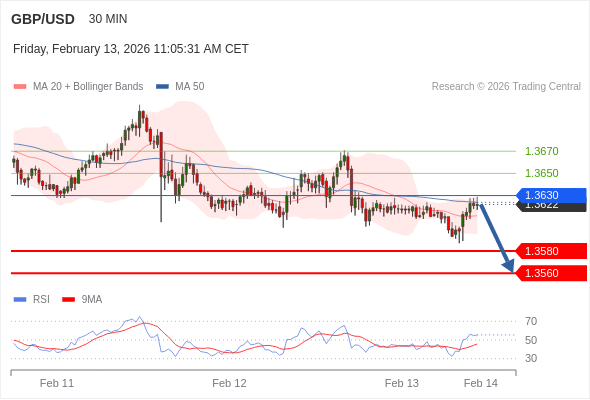 交易策略: 在 1.3630 之下,看跌,目标价位为 1.3580 ,然后为 1.3560 。