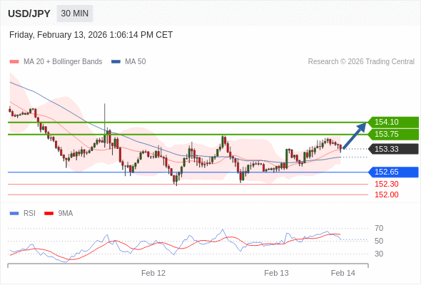在 152.65 之上,看涨,目标价位为 153.75 ,然后为 154.10 。