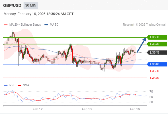 在 1.3610 之上,看涨,目标价位为 1.3670 ,然后为 1.3690 。