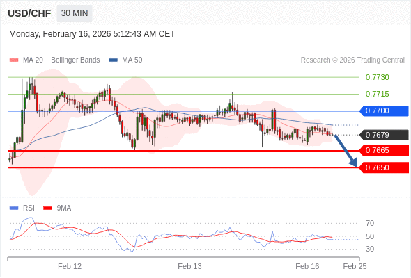 在 0.7700 之下,看跌,目标价位为 0.7665 ,然后为 0.7650 。