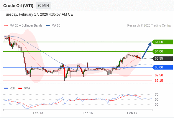 在 63.00 之上,看涨,目标价位为 64.00 ,然后为 64.60 。