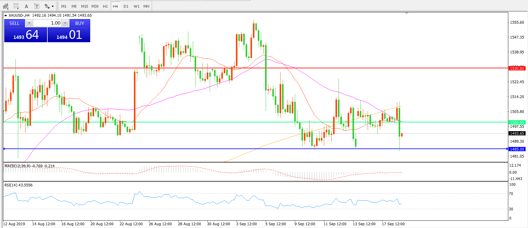 交易策略:在1500.00之下看跌,目标1485.00   1450.00