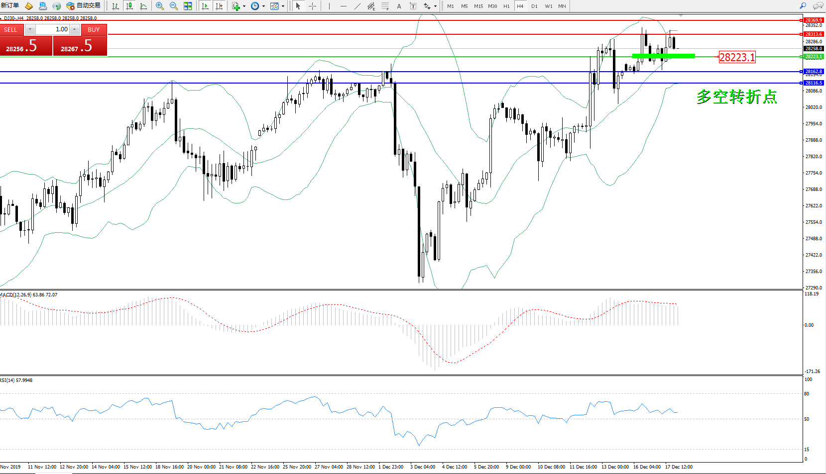 道琼斯指数DJ30—— 4小时K线图显示: