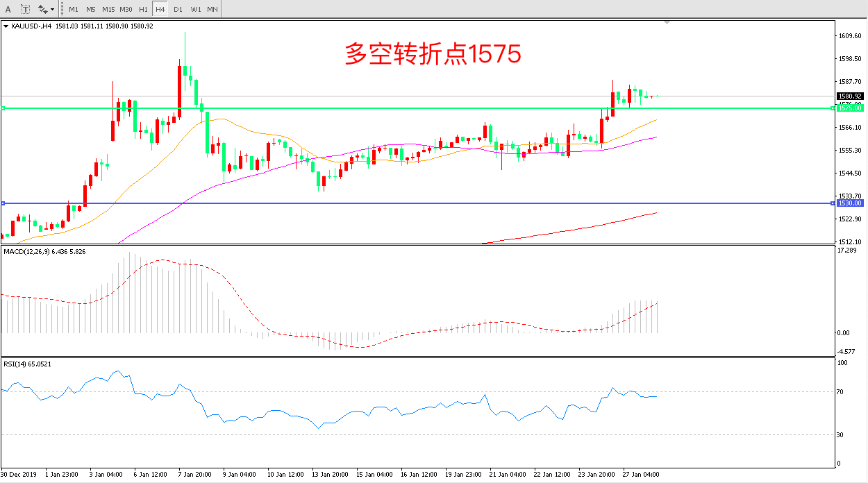 4小时图看,金价跳空高开强势突破1575阻力短期走势偏强,均线系统有拐头迹象 MACD红柱增加RSI指标向上,短期金价维持上行概率较大。
