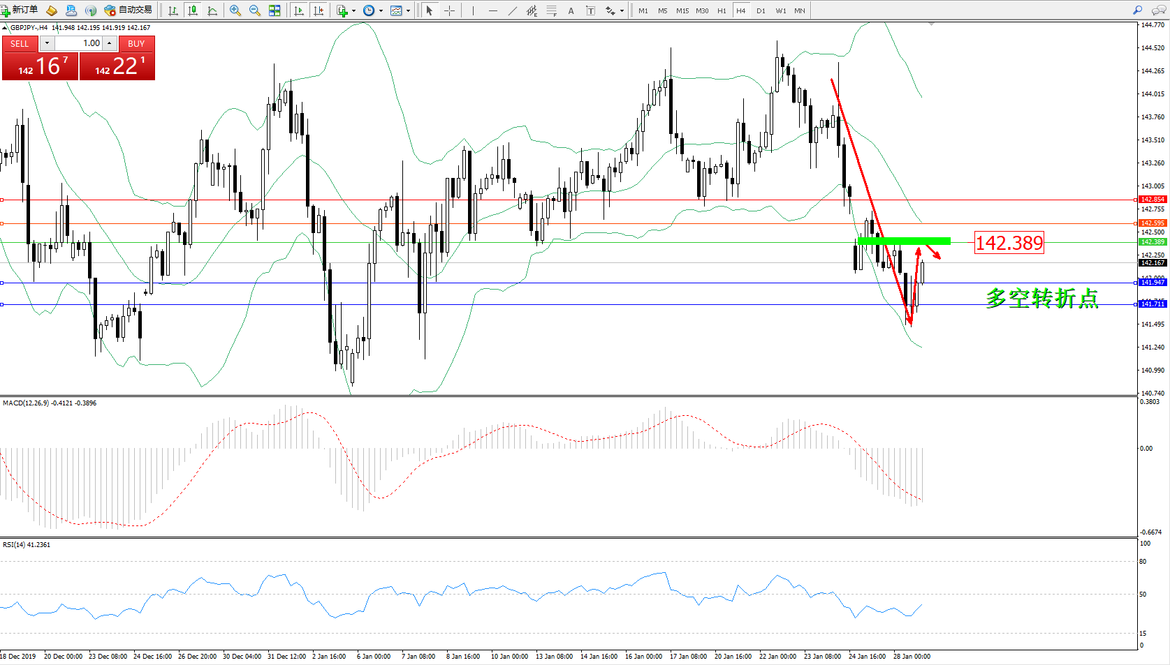 交易策略:142.389下方看跌,目标141.947141.711