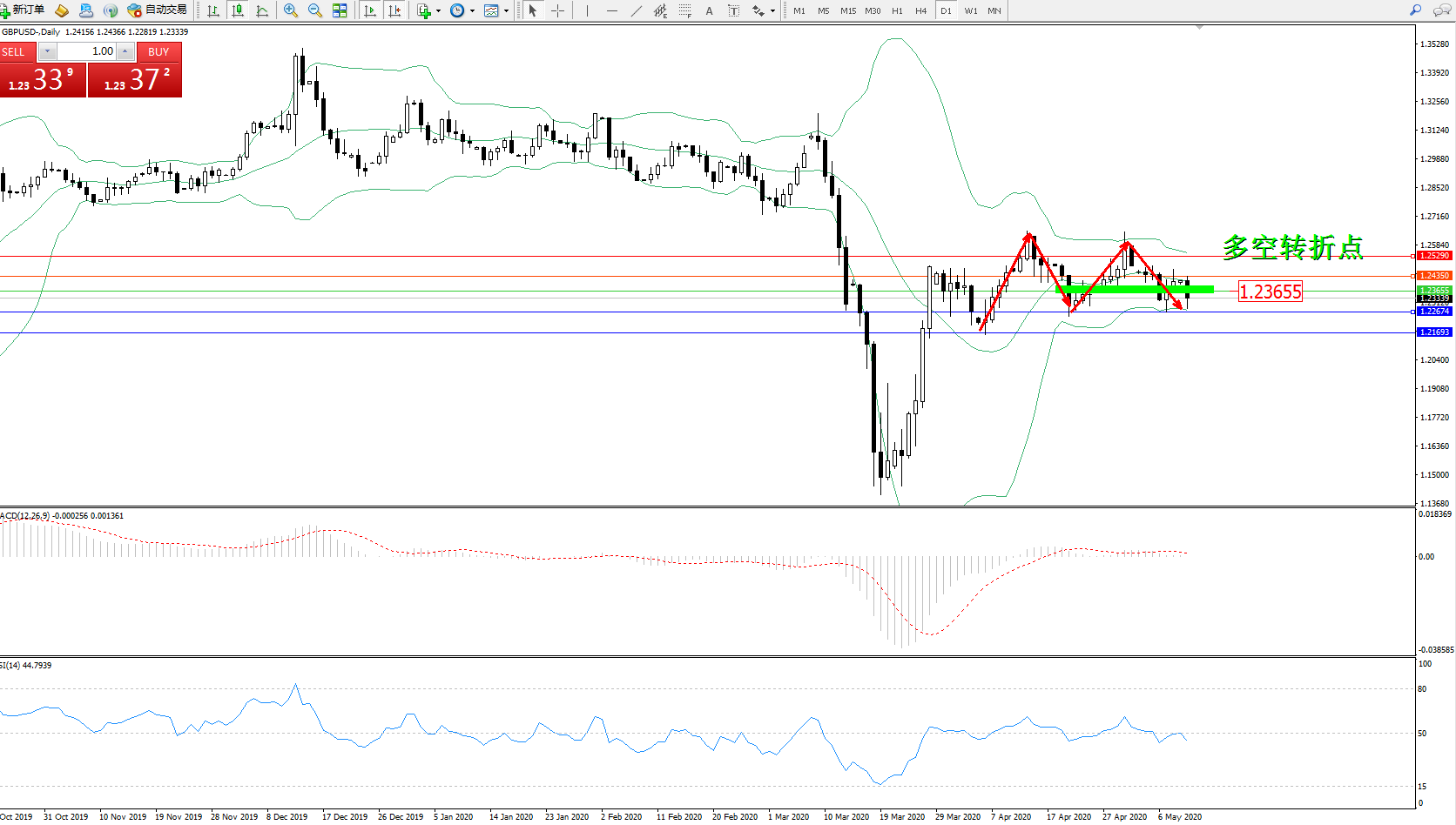 交易策略:1.23655下方看跌,目标1.22674、1.21693