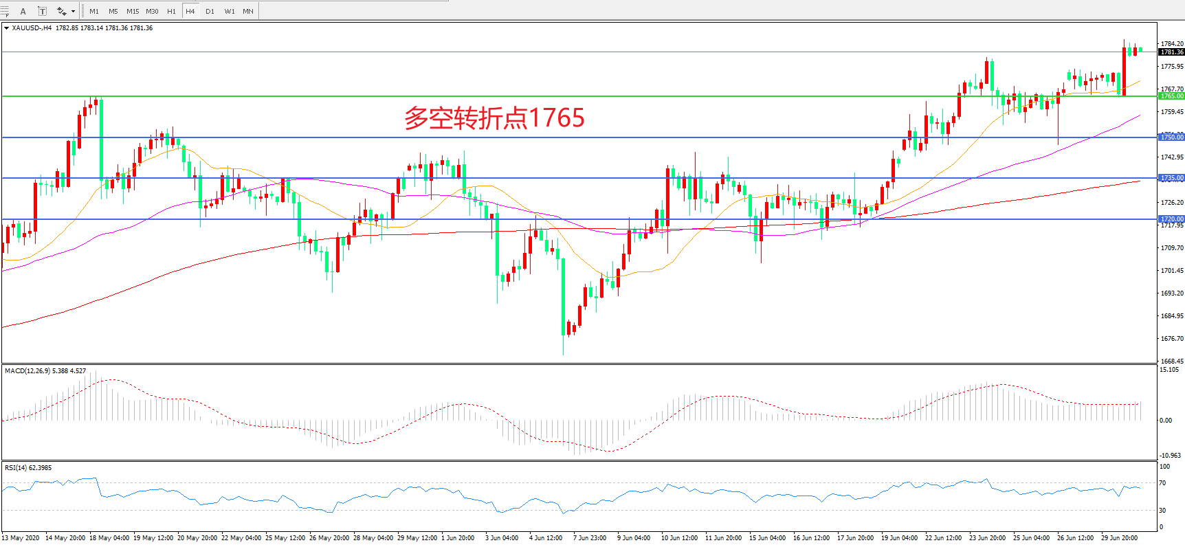 交易策略:在1765.00之上看涨,目标1780.00   1800.00