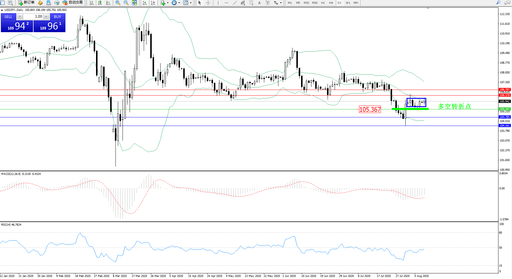 技术点评:高位空头动力延续布林带指标下轨持续弱势下行数日后,低位抵达104.161附近出现快速回升至布林带指标中轨附近呈矩形整理,触及中轨后开始维持弱势震荡,处于转折点上方徘徊,布林带指标呈张口走势后以后收口迹象且下行趋势有形成态势,MACD指标处于0轴线下方空头区域弱势整理震荡下移后开始平移,RSI指标处于空头动力持续震荡下移后出现快速拉升走势;
