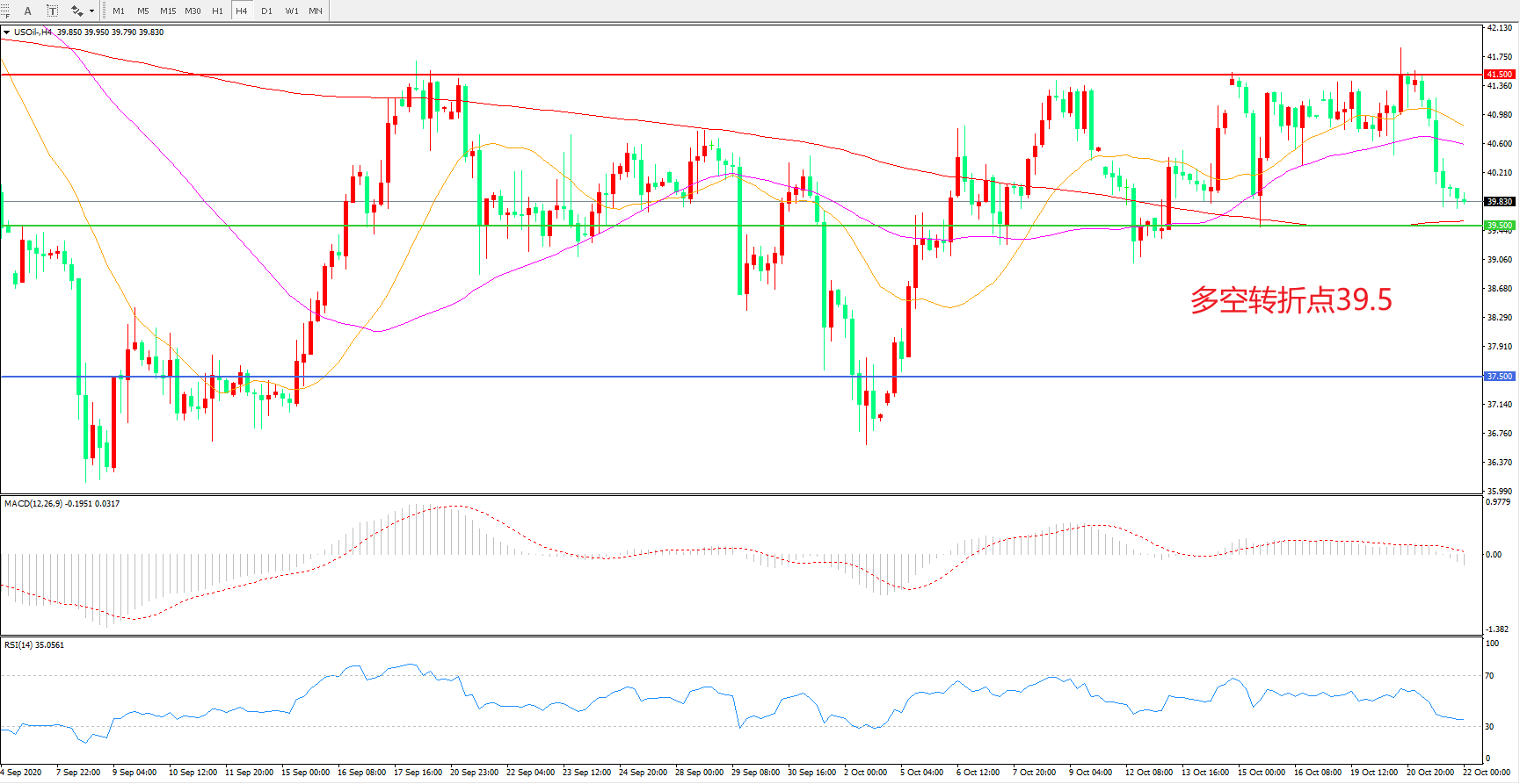 4小时图看,油价触碰41.5一线后大幅下行,整体依旧维持箱体震荡形态,200周期均线成为下方支撑,MACD绿柱增加,RSI指标走平,日内延续震荡概率较大。