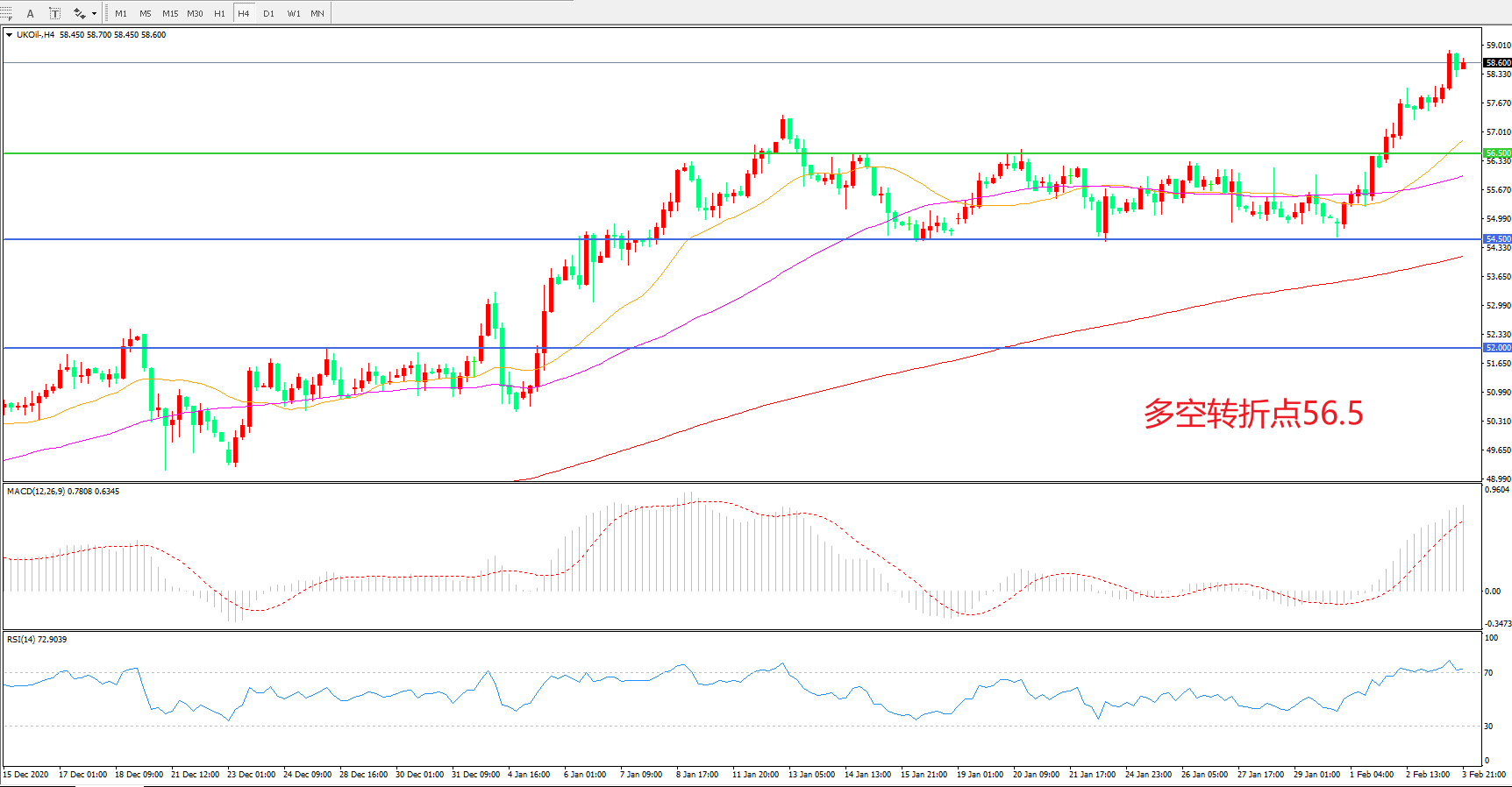 4小时图看,油价连续拉升,整体表现偏强,56.5一线被突破后快速拉升,多头趋势正在形成,MACD红柱增加,RSI指标向上,日内延续上行概率较大。