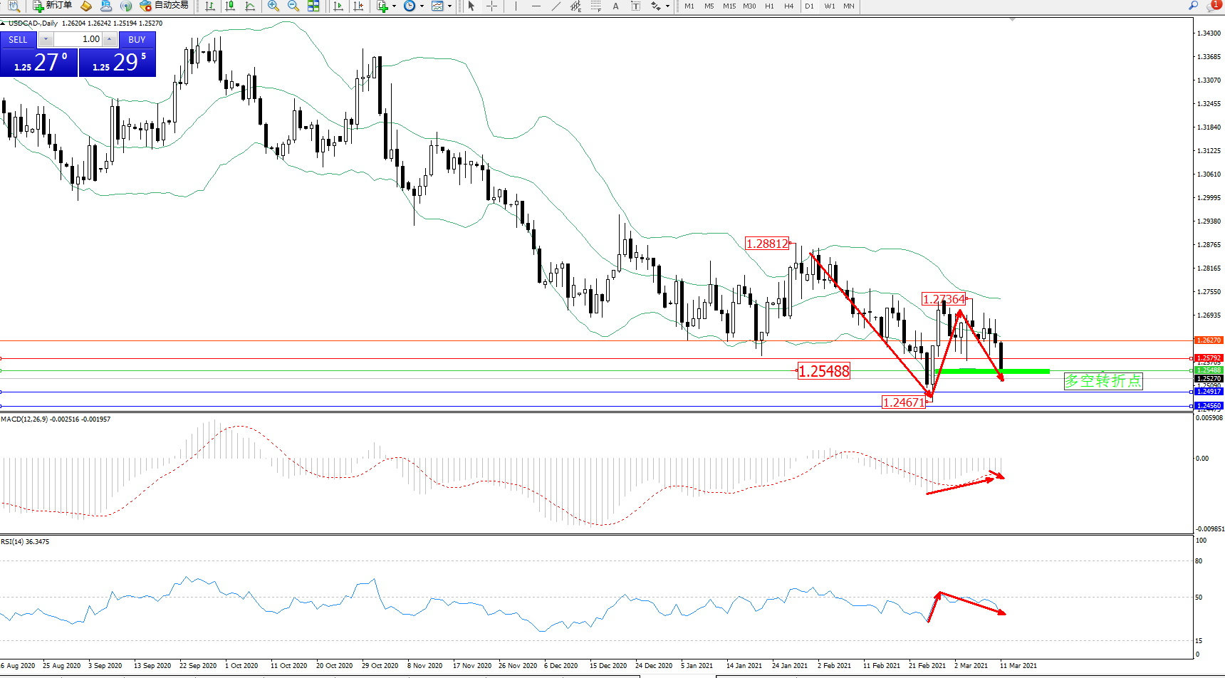 美元加元USDCAD——日K线图显示:
