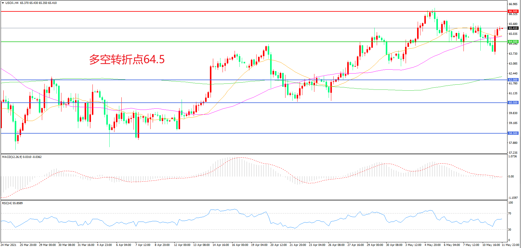 4小时图看,油价回踩63美元后后再次拉升,区间震荡迹象较为明显,66.5美元成为上方阻力,55周期均线成为下方支撑,MACD红柱增加,RSI指标走平,日内震荡延续概率较大。
