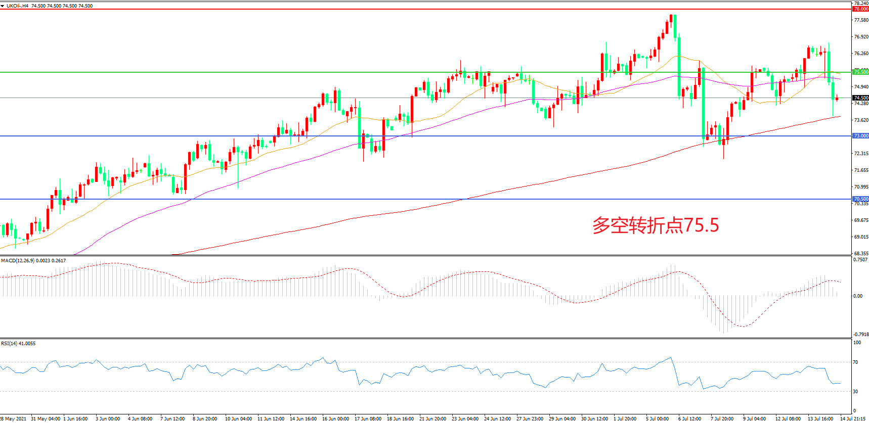 交易策略:在75.50之下看跌,目标73.00 70.50
