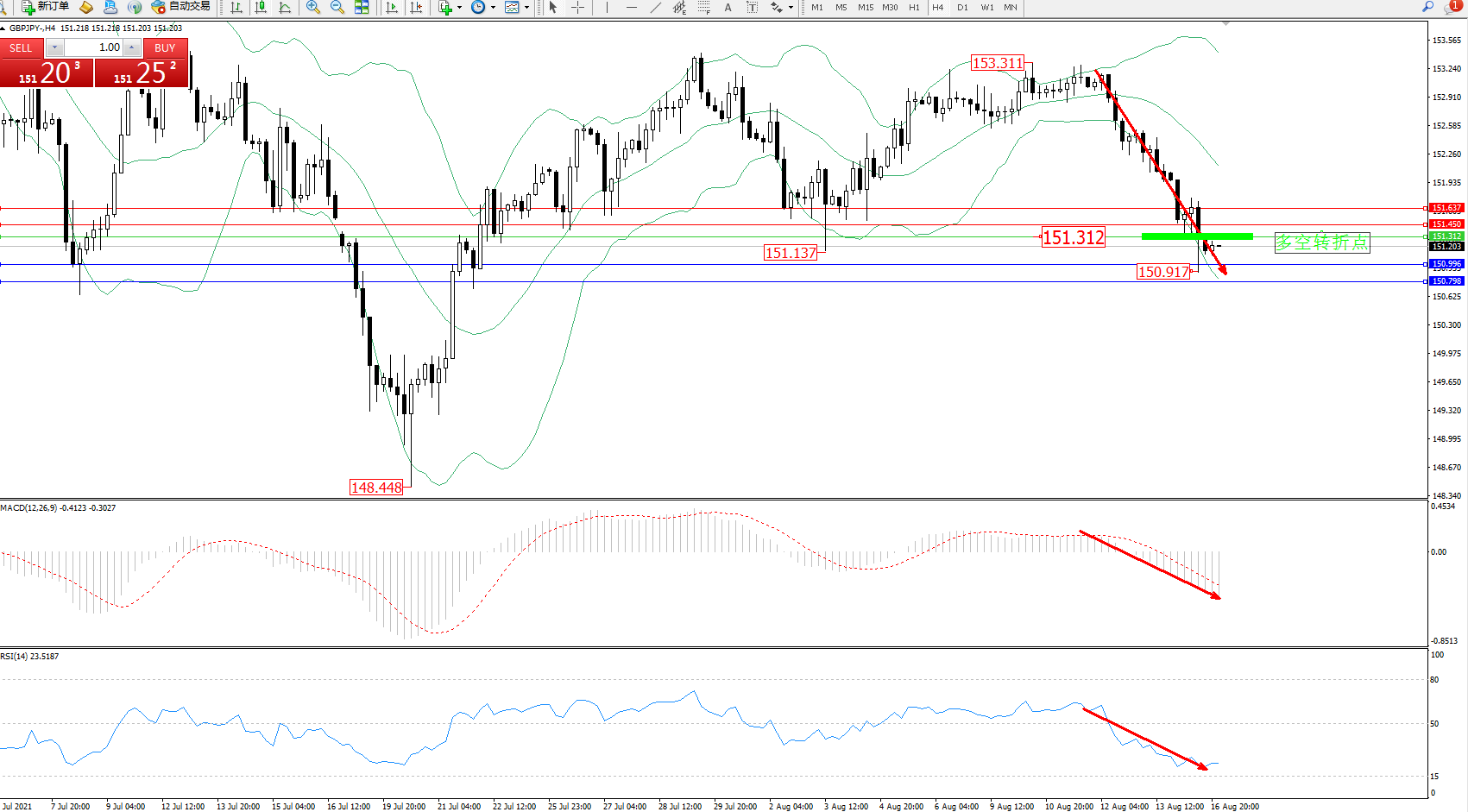 交易策略:151.312下方看跌,目标150.996、150.798