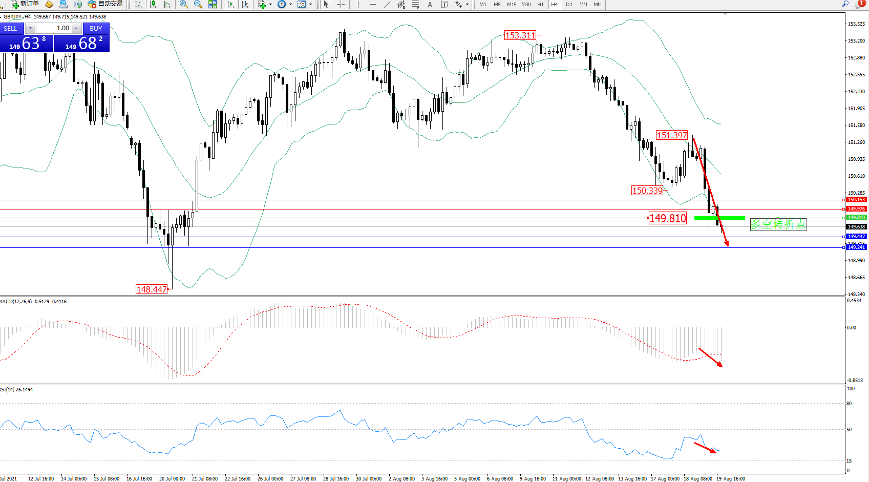 交易策略:149.810下方看跌,目标149.447、149.241