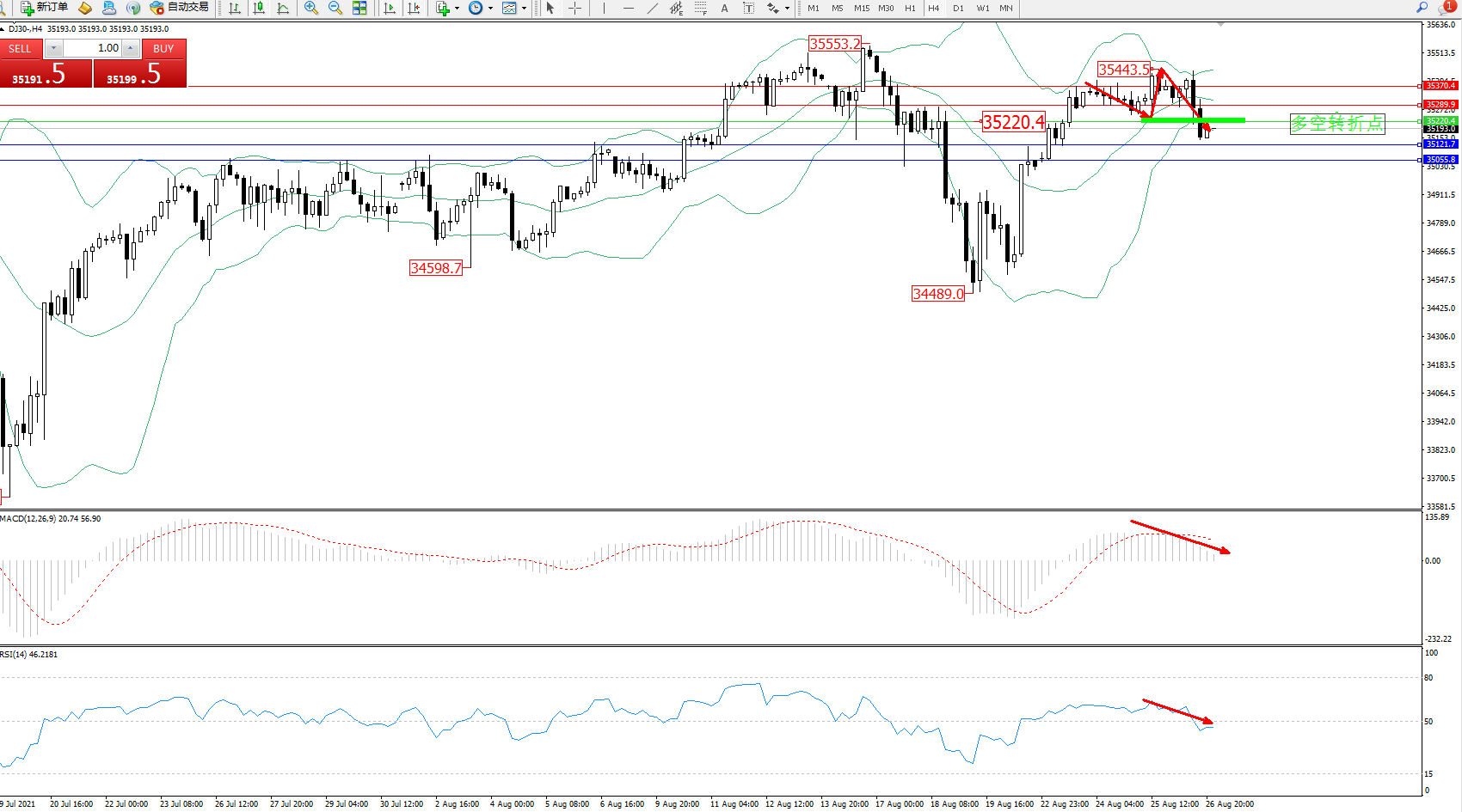 道琼斯指数8月26日(周四)收盘下跌192.38点,跌幅0.54%,报35213.12点;美股收盘,三大股指表现疲软,市场避险情绪陡然升温。美国股市延续跌势,投资者等待美联储的杰克逊霍尔研讨会提供削减刺激政策的线索;市场将密切关注美联储主席鲍威尔周五的主旨演讲,以了解美国央行打算何时以及如何缩减资产购买的任何最新信号。