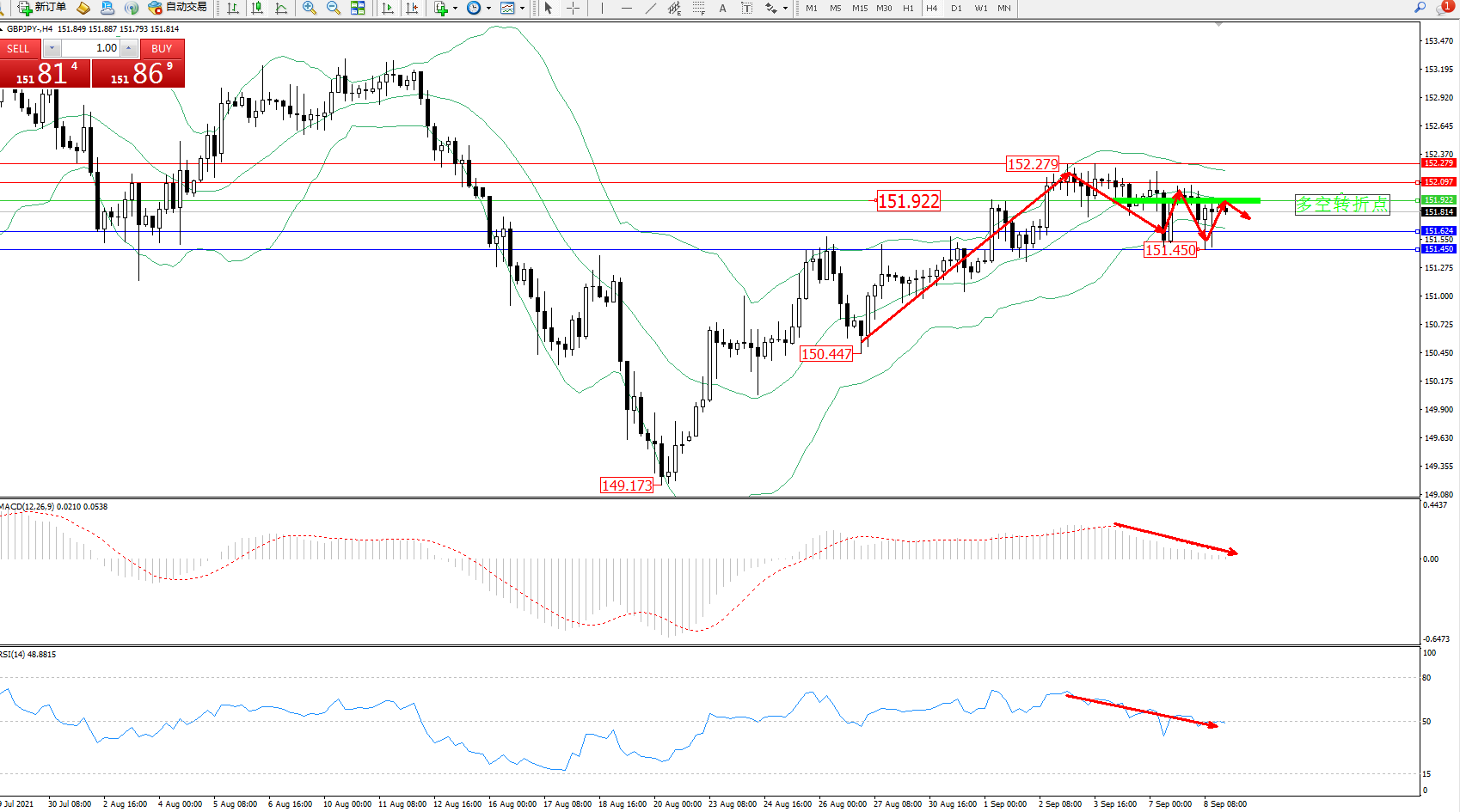 交易策略:151.922下方看跌,目标151.624、151.450