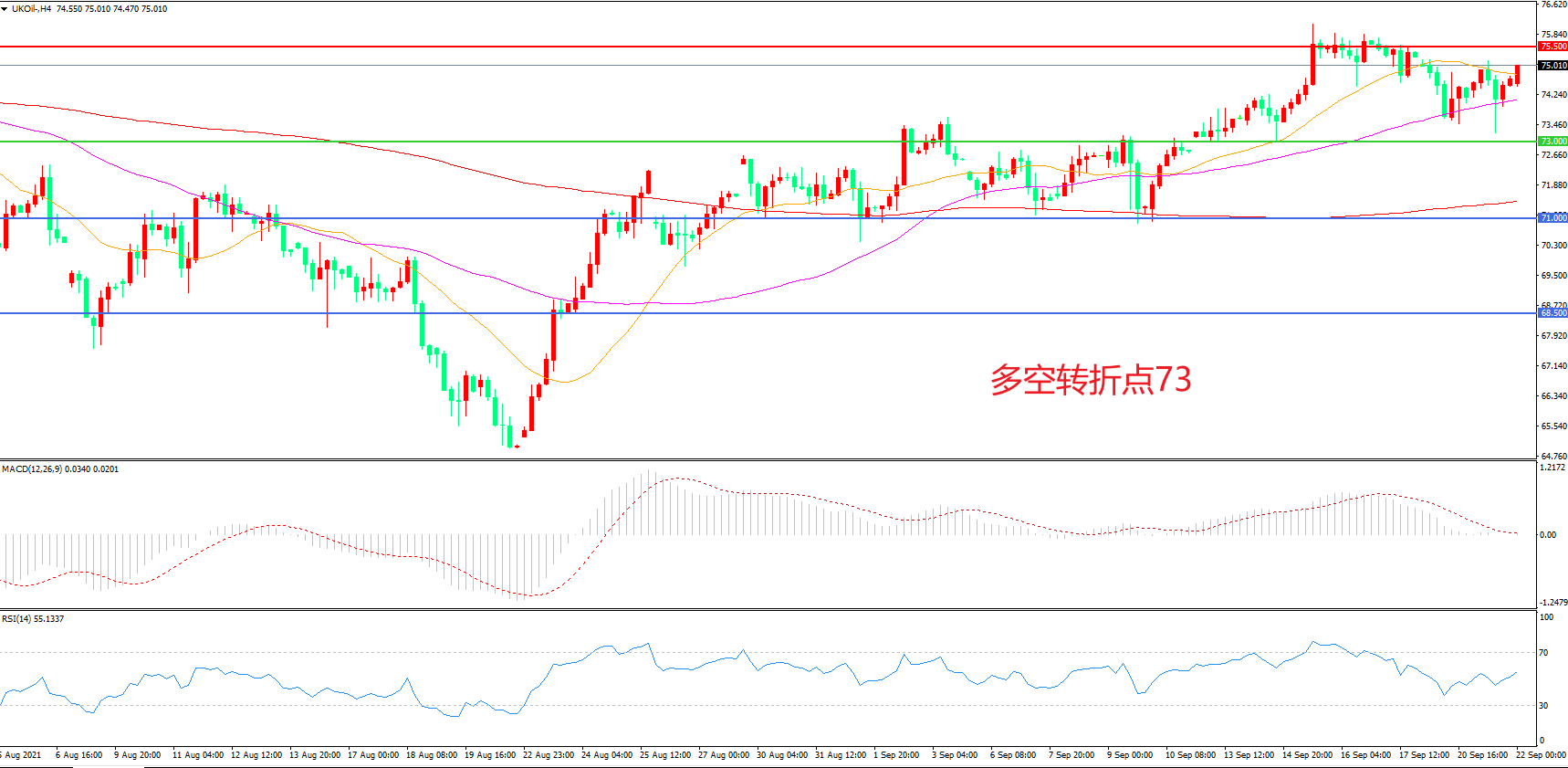 4小时图看,油价整体呈现区间震荡形态,73美元成为短期支撑,75.50美元成为上方阻力,均线系统走平,MACD红柱缩短,日内小幅反弹概率较大。