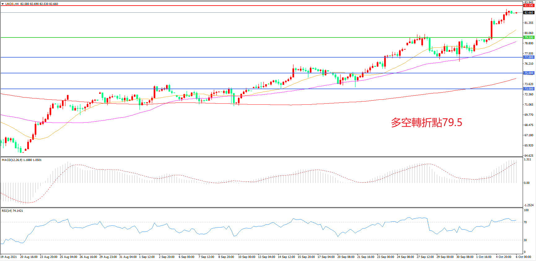 4小时图看,油价触碰83.5美元附近后小幅回落,上行趋势依然完好,均线系统呈多头排列,MACD红柱缩短,RSI指标走平,日内震荡上行概率较大。