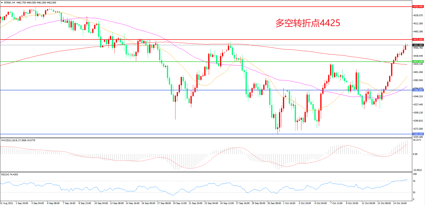 4小时图看,标普500阳线连续拉升,短期表现偏强,短期均线拐头向上,MACD红柱增加,RSI指标走平,日内震荡上行概率较大。