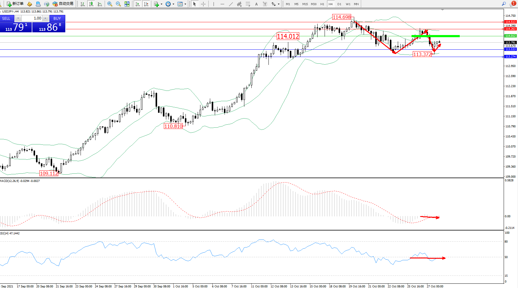 交易策略:114.012下方看跌,目标113.533、113.274