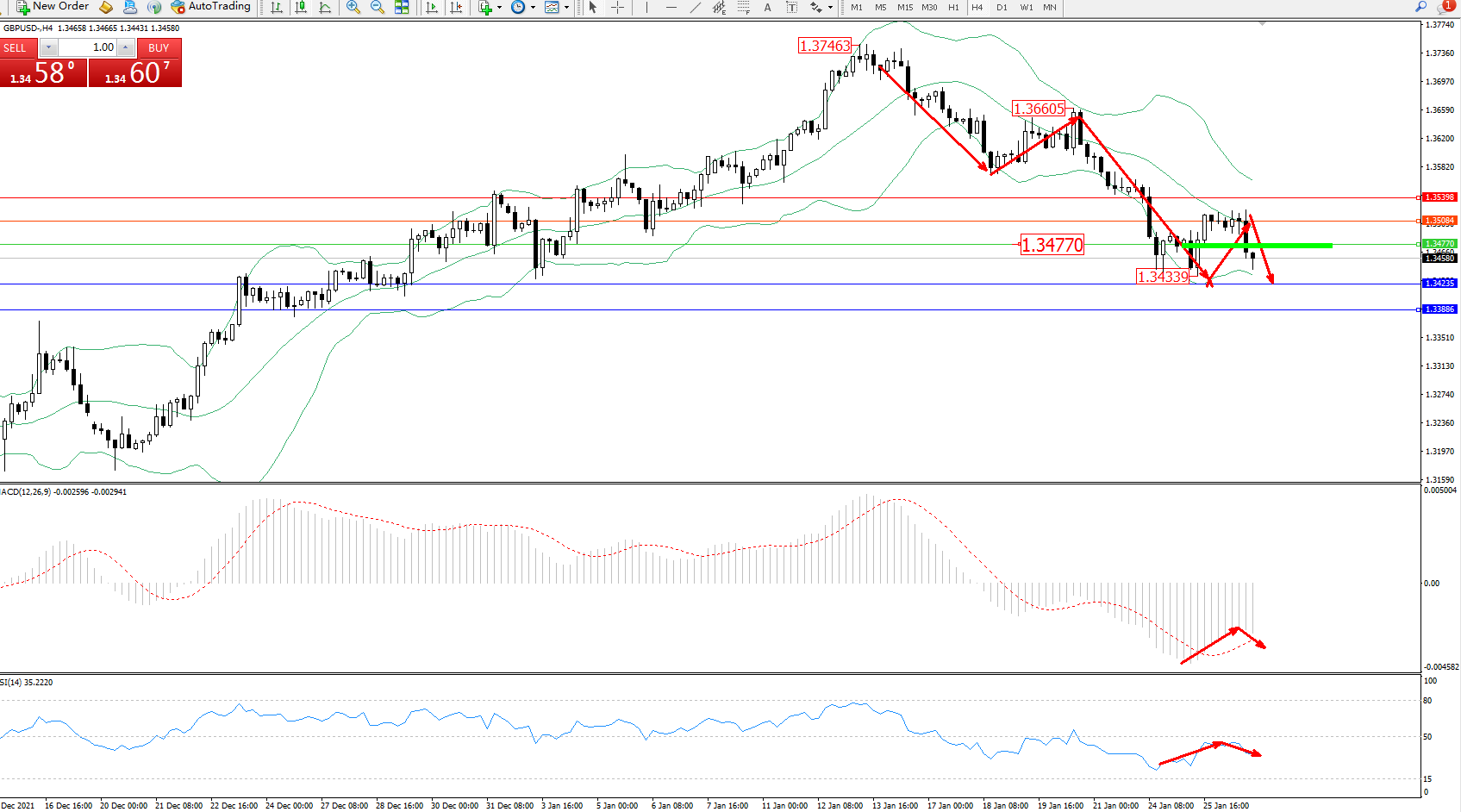 交易策略:1.34770下方看跌,目标1.34235、1.33886