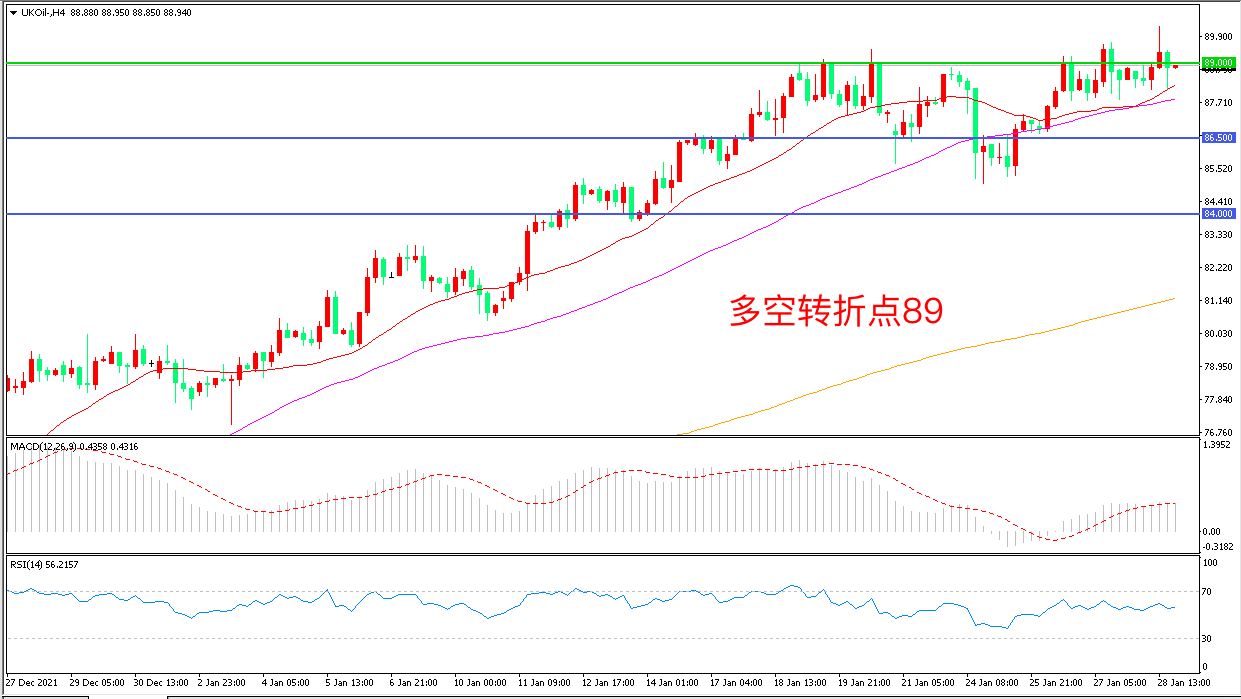 4小时图看,油价延续高位调整走势,区间震荡继续明显,均线系统成为下方支撑,89成为多空分水岭,MACD红柱增加,RSI指标走平,日内震荡上行概率较大。