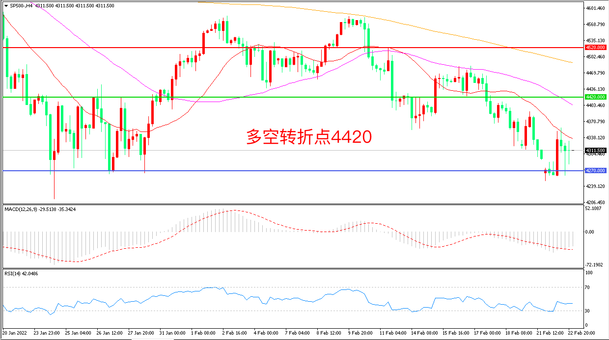 周二(2月22日),俄罗斯承认乌克兰东部两个地区为独立的共和国,并下令部署军队后,俄乌局势进一步激化,欧美分别宣布了针对俄罗斯的新一轮制裁,标普500巨幅波动后,收报4311.50点。目前市场在开战威胁的阴云笼罩下,避险情绪高涨,风险资产被集体抛售,如果俄乌局势再度恶化,美股可能迎来更大跌幅。