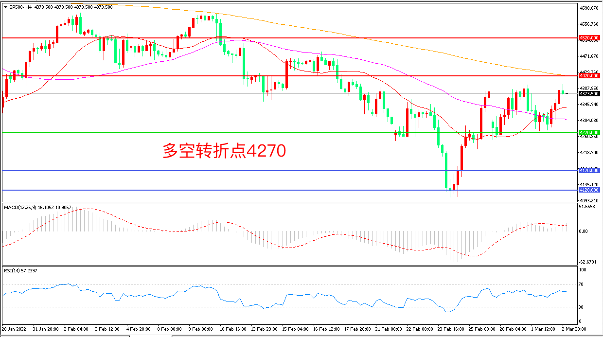 周三(3月2日),美联储主席鲍威尔并未流露3月就一次加息50个基点的偏好,而是称他倾向3月加息25个基点,市场情绪收到提振,标普500震荡反弹,收报4373.50点。短期来看,持续的战争和制裁措施对美国经济的短期影响仍然非常不确定,在油价飙升的背景下,美股延续宽幅震荡概率较大。