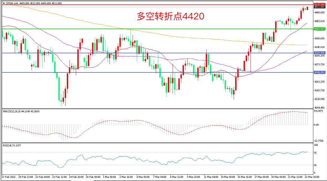 周二(3月22日),市场持续消化美联储主席鲍威尔将一次性大幅加息50个基点摆上台面的消息,标普500在中概股的爆发下大幅上行,收报4505.05点。在疫情逐步改善、库存修复、渠道阻塞逐步缓解的背景下,美国整体增长虽然无法加速但仍能维持一个相对稳健的增长,重点关注联储高层近期的发言表现。