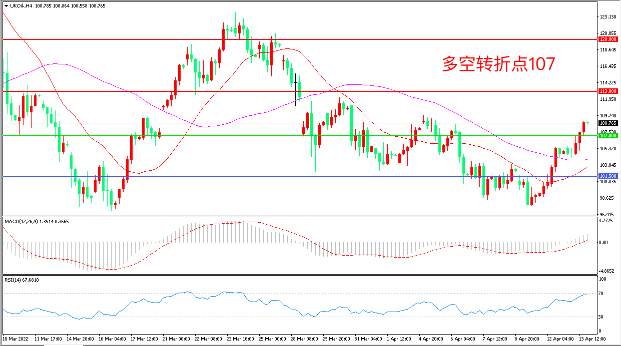 4小时图看,油价突破均线阻力后再度拉升,短期走势回暖,107美元成为多空分水岭, MACD红柱增加,RSI指标走平,日内震荡上行概率较大。